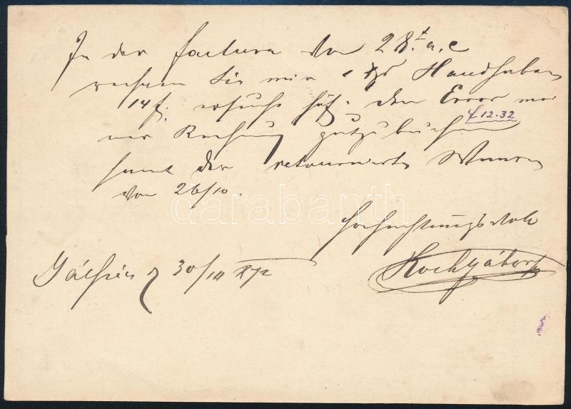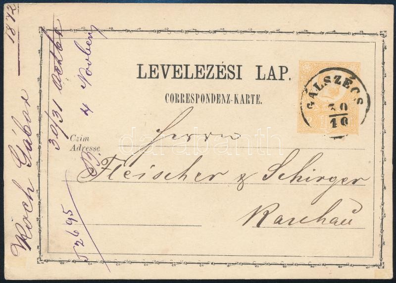 Leírás: 1872 2kr díjjegyes levelezőlap / PS-card "GÁLSZÉCS"