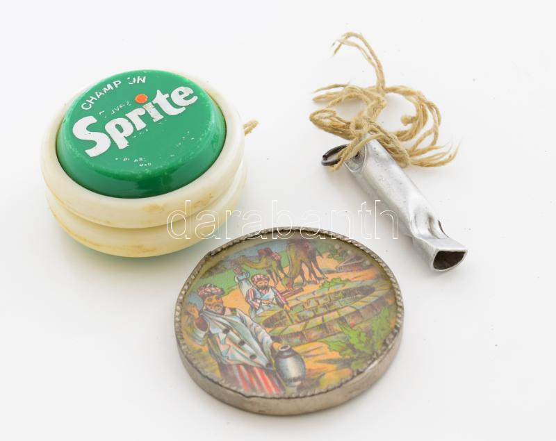 Leírás: 3 darab retro tárgy, yoyo, síp, tükör