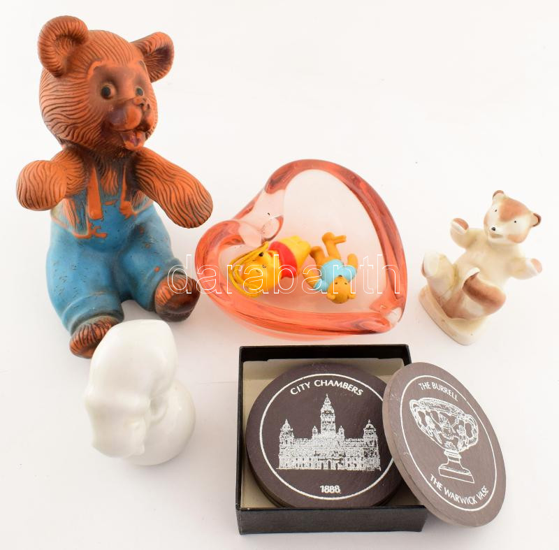 Leírás: Vegyes bolha tétel: különféle maci figurák (porcelán, sípolós gumi, stb.), szív alakú üveg tálka, poháralátét készlet.