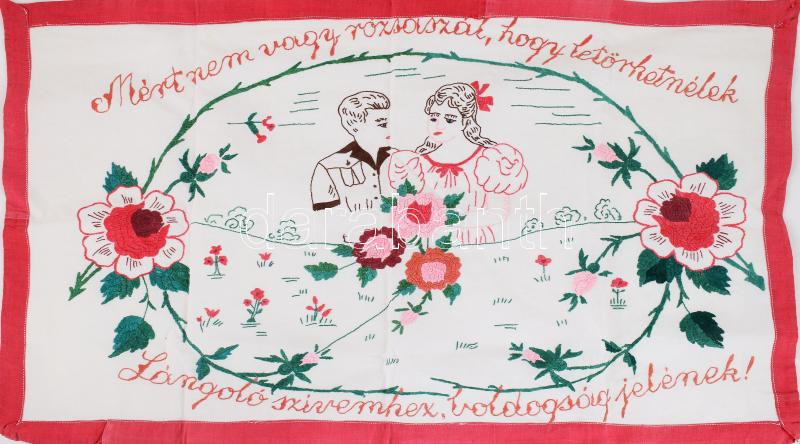 Leírás: Kézzel hímzett konyhai falvédő, "Mért nem vagy rózsaszál, hogy letörhetnélek, Lángoló szivemhez, boldogság jelének!" felirattal, 46x80 cm