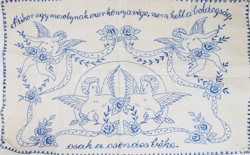 Leírás: Kézzel hímzett konyhai falvédő, "Mikor egy mosolynak ezer könny a vége, nem kell a boldogság, csak a csöndes béke" felirattal, 50x78 cm
