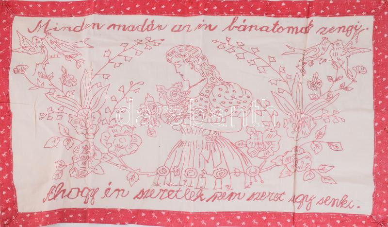 Leírás: Kézzel hímzett konyhai falvédő, "Minden madár az én bánatomat zengi, Ahogy én szeretlek, nem szeret úgy senki" felirattal, 41x71 cm