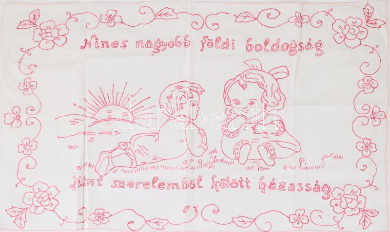 Leírás: Kézzel hímzett konyhai falvédő, "Nincs nagyobb földi boldogság, mint szerelemből kötött házasság" felirattal, 43x71 cm