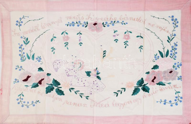 Kézzel hímzett konyhai falvédő, "Szemedből könnyet ne ejts, szívedbe bánatot ne rejts, ajkadról ne száljon panasz, életed legyen egy viruló tavasz." felirattal, 50x76 cm
