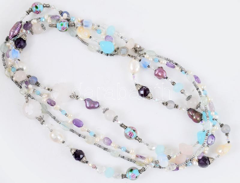 Leírás: Négysoros achátos tengeri gyöngyös nyaklánc, h: 48 cm