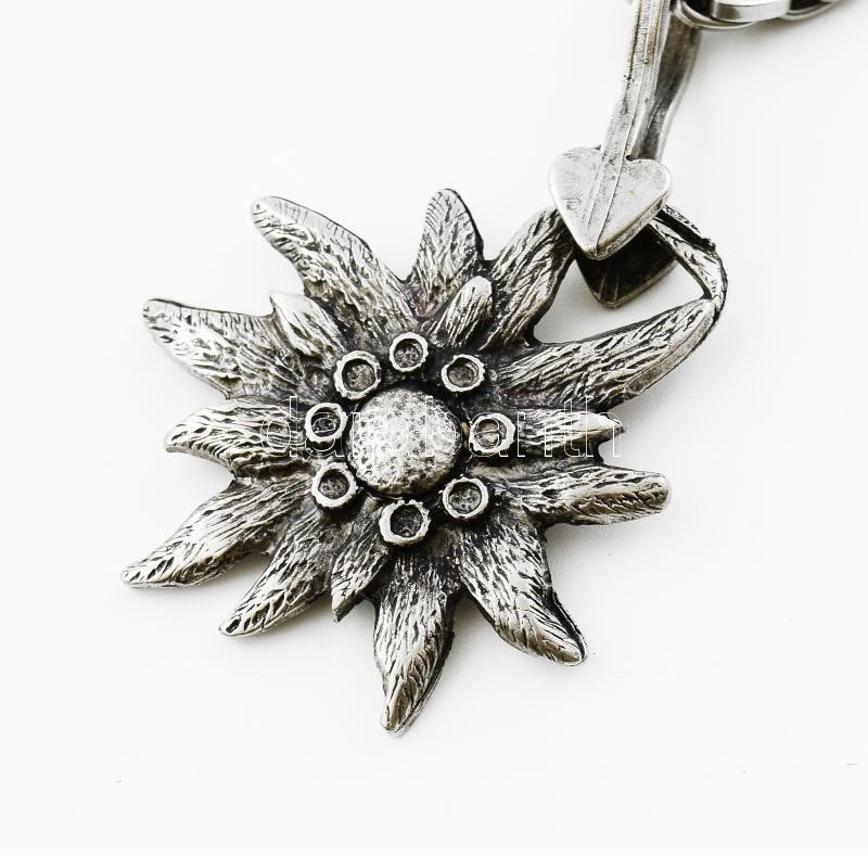 Leírás: Nyaklánc fém havasi gyopár medállal, h: 35 cm