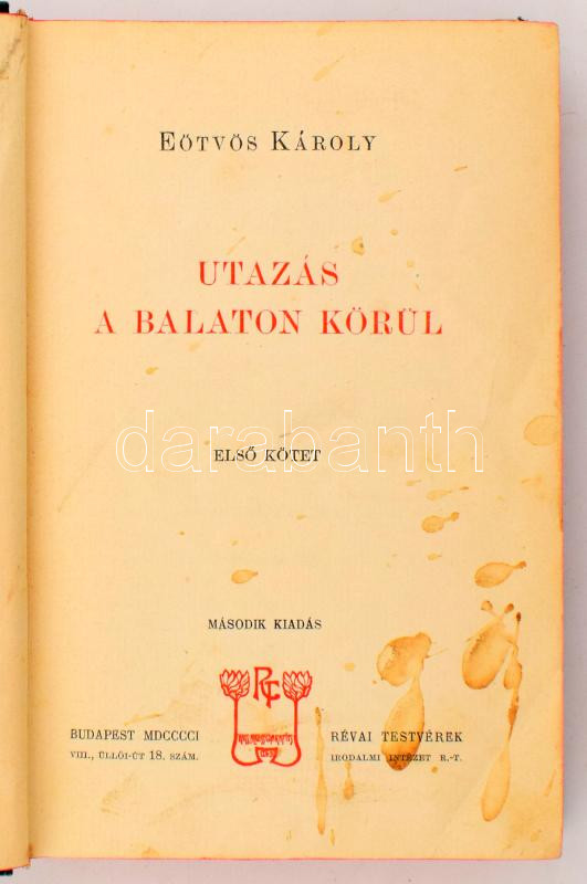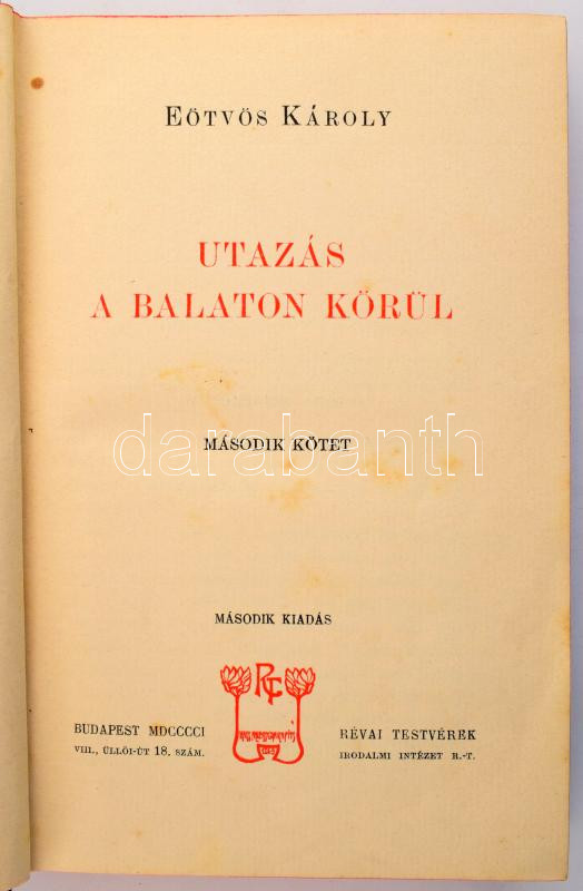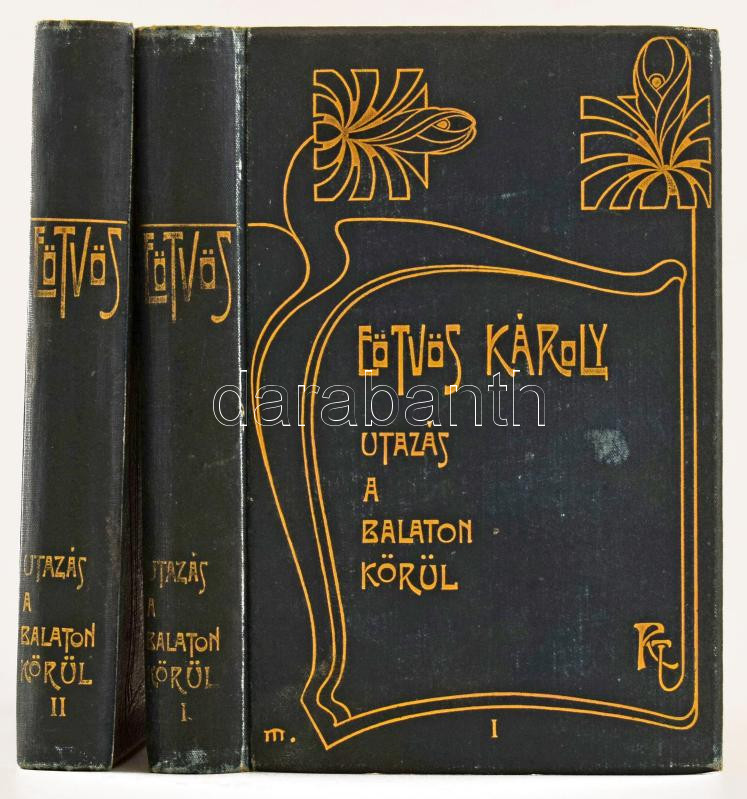 Eötvös Károly: Utazás a Balaton körül. I-II köt. Eötvös Károly Munkái I-II. Bp., 1901, Révai, 2 sztl. lev.+ 301+(3) p.; 2 sztl. lev.+ 299+(1) p. Kiadói aranyozott, szecessziós egészvászon-kötés, Gottermayer-kötés, festett lapélekkel, kissé kopott borítókkal, helyenként foltos lapokkal (néhány erősebben foltos lappal).