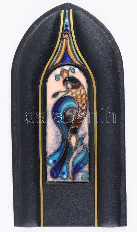 Leírás: Czóbel Marianna:Páva tűzzománc kép bőr keretben. Jelzett Külső méret 13x27 cm