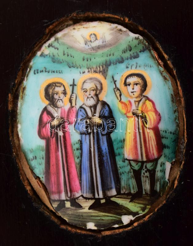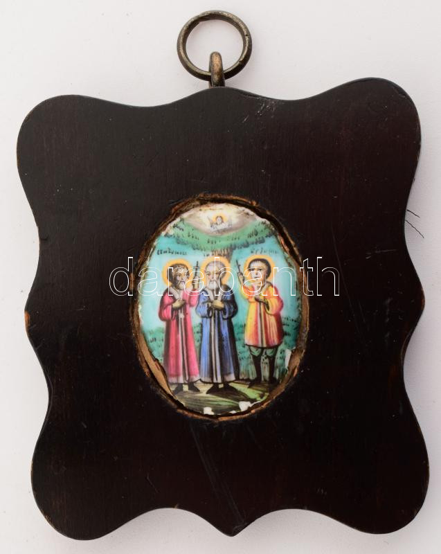 Leírás: Háromkirályok. Kézzel festett porcelán kegytárgy kép, kis pattogzással, fa keretben, 3,5x2,5 cm