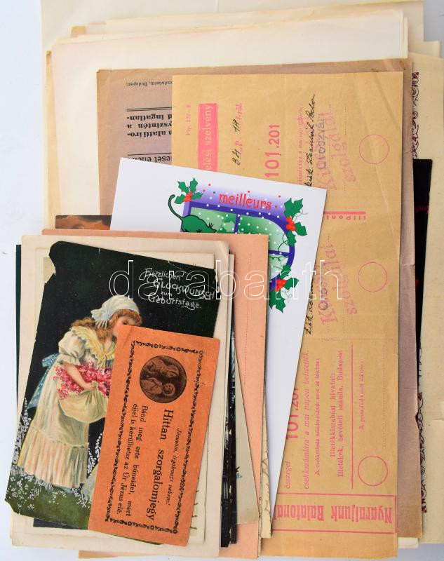 Leírás: ca 1920-1940 Papírrégiség tétel: reklámok, közöttük szecessziósak, szorgalomjegy, képeslpok, üdvözlőkártyák, litho, állami nyereménykölcsön, vagyonátruházási illeték, stb.