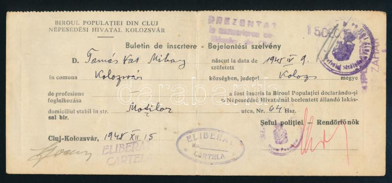 1945 Cluj/Kolozsvár, népesedési bejelentési szelvény https://www.darabanth.com/hu/500-Gyorsarveres/500.0/Mutargy-papirregiseg-egyeb/Okmanyok~1000001/1945-ClujKolozsvar-nepesedesi-bejelentesi-szelveny~II3409830