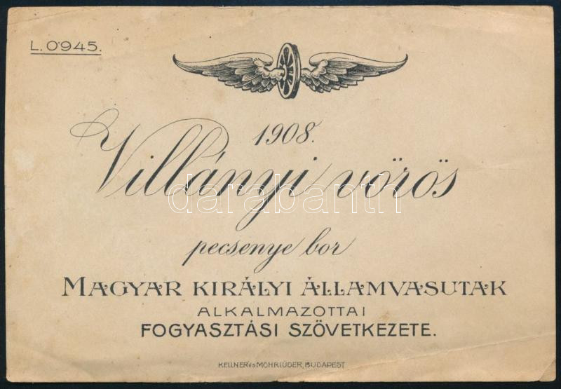Leírás: 1908 Villányi vörös pecsenye bor, Magyar Királyi Államvasutak (MÁV) alkalmazottai fogyasztási szövetkezete címke, 8x12 cm