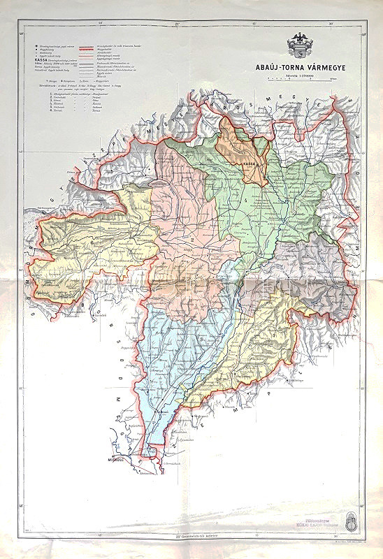 Domborzati és vízrajzi részleteket is feltüntető térképünk a M. kir. Honvéd Térképészeti Intézet 1937-1941 között készült közigazgatási térképsorozatának tagja. Abaúj-Torna vármegye régi közigazgatási egység, melynek területét nyugat-keleti irányban kettévágta a trianoni döntés. Az eredeti nevét megtartó vármegye 1923 és 1938 között szikszói székhellyel működött, majd az 1938 novemberi első bécsi döntéssel, Kassa székhellyel visszanyerte csaknem teljes területét, a legészakabbi mecenzéfi, kassahámori és rozgonyi területek kivételével.