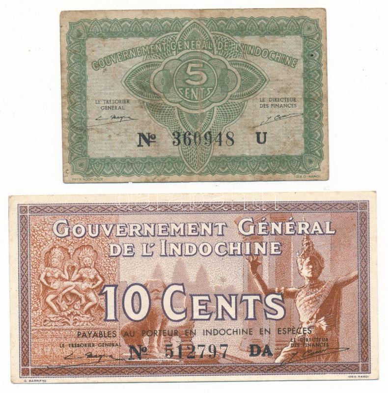 French Indochina ND(1939) 10 Cents "512797 DA" + ND(1942) 5 Cents "360948 U" C:AU,VG