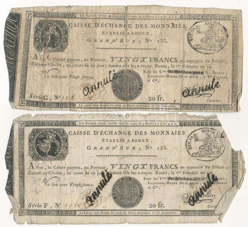Franciaország / Rouen 1797-1803. 20Fr "annulé (érvénytelen)"... https://www.darabanth.com/hu/500-Gyorsarveres/500.0/Numizmatika/Kulfoldi-bankjegyek~1500061/Franciaorszag-Rouen-1797-1803-20Fr-annule-ervenytelen-felulbelyegzessel-2x-TG-Franc~II2968278