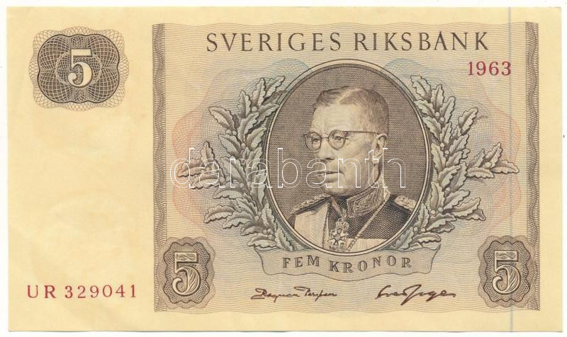 Sweden 1963.... https://www.darabanth.com/hu/500-Gyorsarveres/500.0/Numizmatika/Kulfoldi-bankjegyek~1500061/Svedorszag-1963-5K-UR-329041-TF-szep-papir3Cbr-3E-Sweden-1963-5-Kronor-UR-329041-CF-fine~II3406233