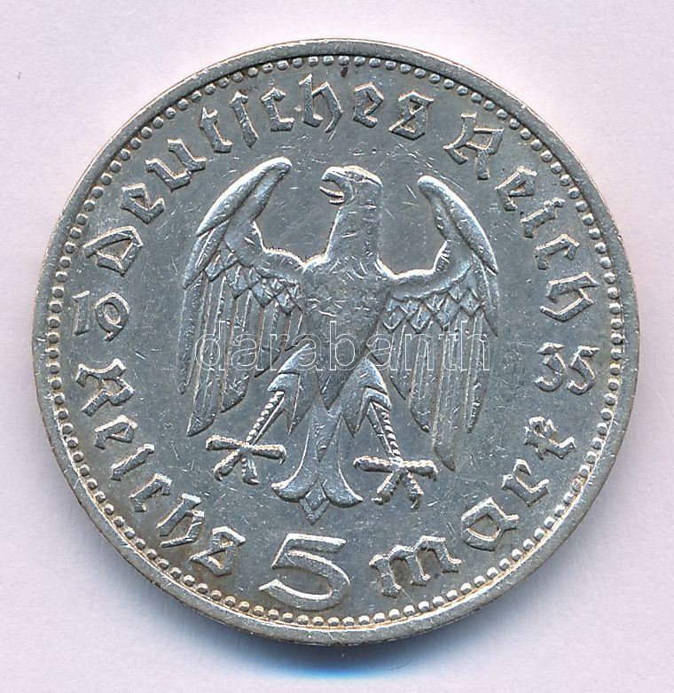 Germ... https://www.darabanth.com/hu/500-Gyorsarveres/500.0/Numizmatika/Kulfoldi-fem-es-ezustpenzek~1500062/Nemet-Harmadik-Birodalom-1935D-5M-Ag-Hindenburg-TXF3Cbr-3E-German-Third-Reich-1935D-5-Reichsmark~II3408604