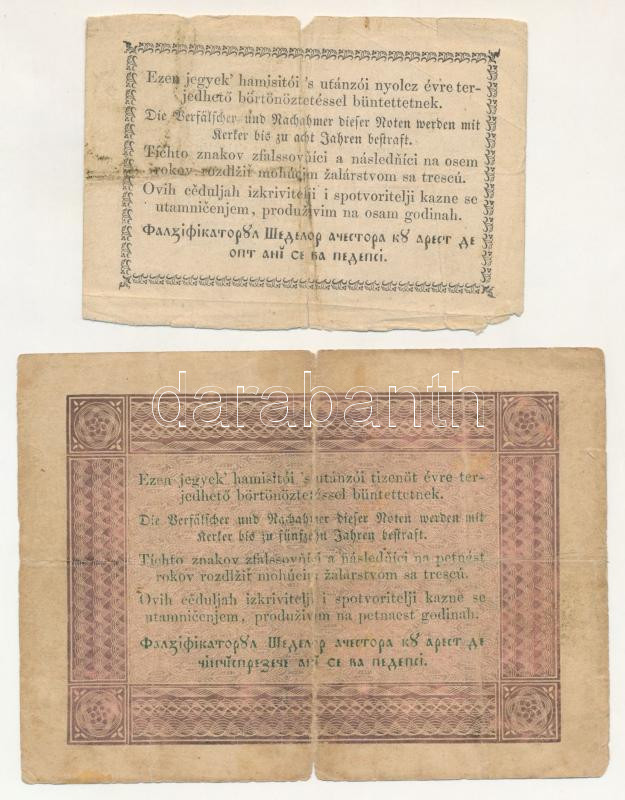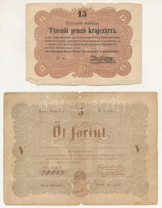 Leírás: 1848. 5Ft "Kossuth bankó" barna nyomat + 1849. 15kr T:F,VG beszakadások, lyuk