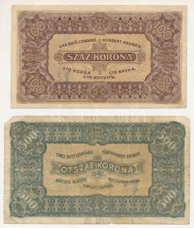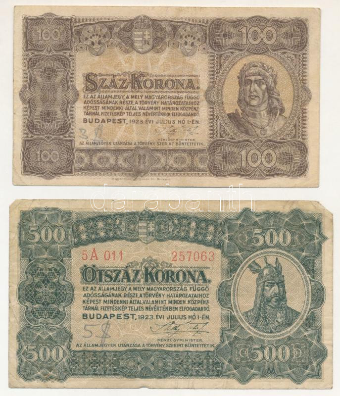 Leírás: 1923. 100K "Magyar Pénzjegynyomda Rt." nyomdahely jelöléssel + 500K "5A 011 257063" T:F,VG