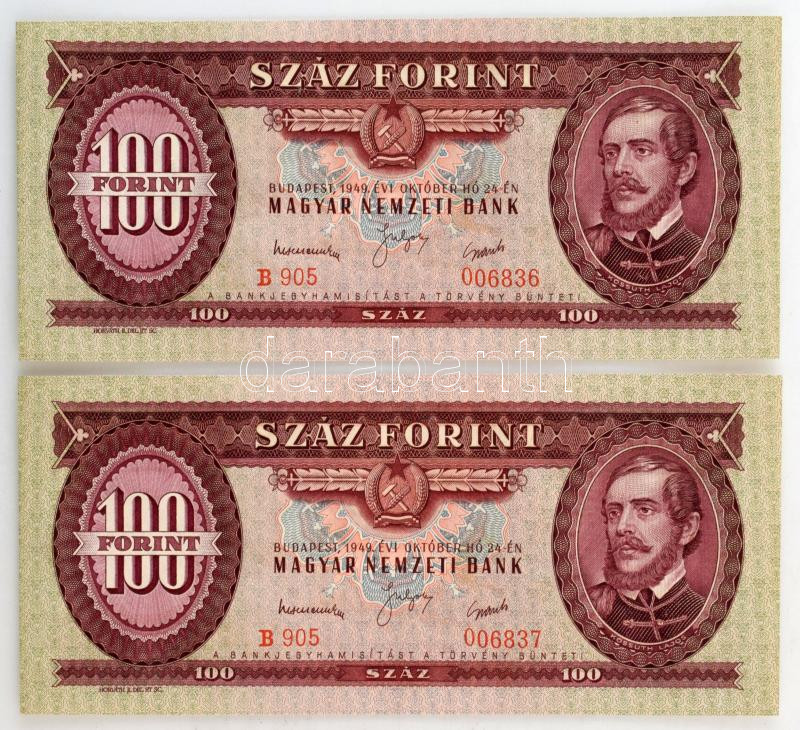 Leírás: 1949. 100Ft (2x) sorszámkövetők "B 905 006836 - B 905 006837" T:AU, enyhe nyomdai papírráncokkal, kissé hullámos papír, sarokhajlás