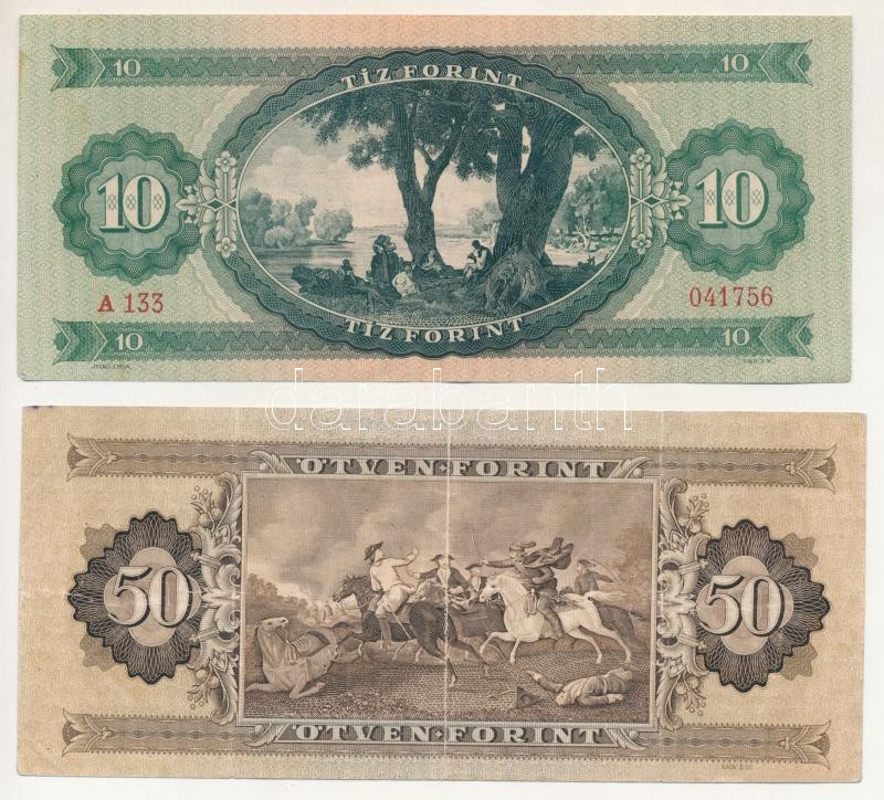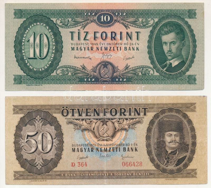 Leírás: 1949. 10Ft "A 133 041756" + 1951. 50Ft "D 364 066428" T:XF,F