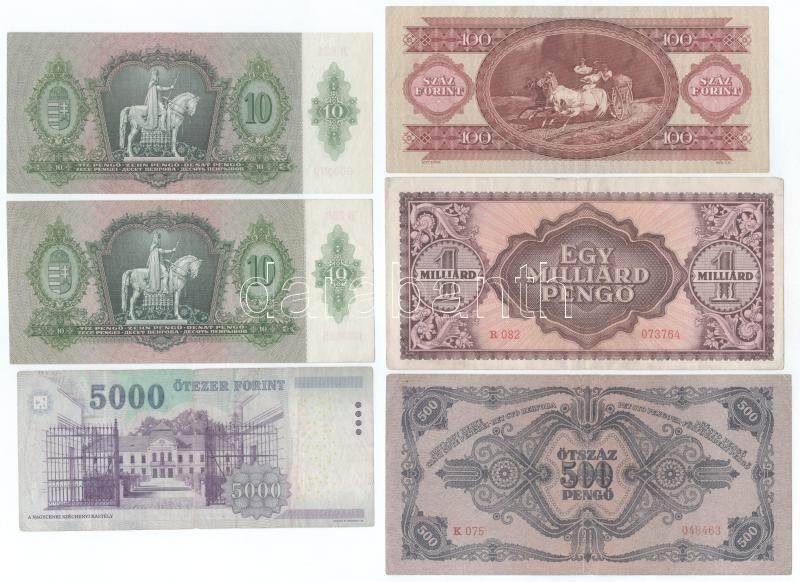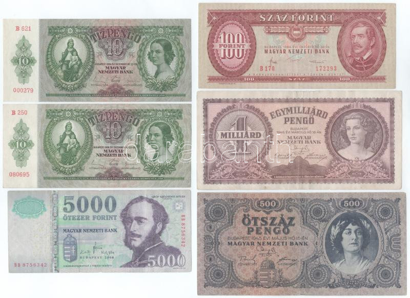 Leírás: Vegyes, 6db-os magyar bankjegytétel, közte 2008. 5000Ft "BB" + 1936. 10P alacsony "B 621 000279" sorszámmal T:F közte szép papír