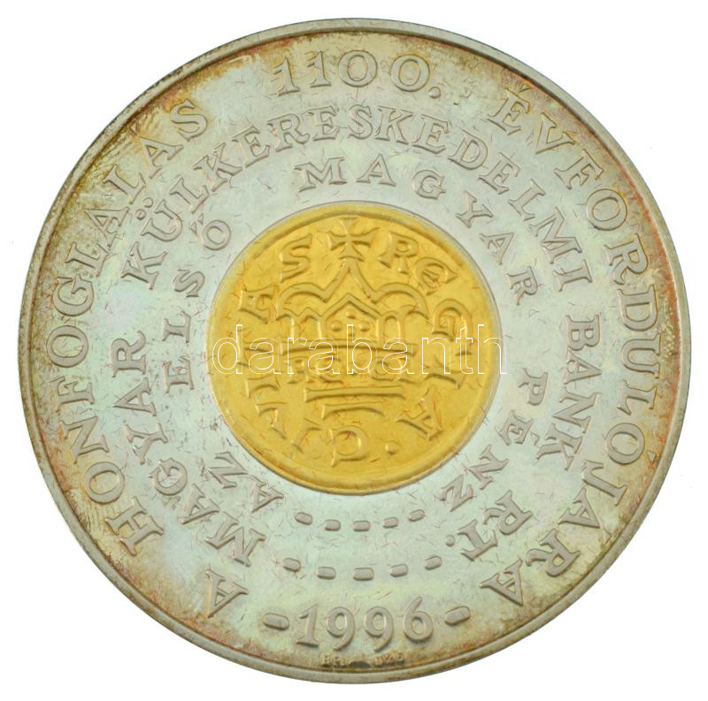 Lebó Ferenc (1960-) 1996. "A Honfoglalás 1100. évfordulójára - Magyar Külkereskedelmi Bank Rt. - Első magyar pénz / Hungarian Conquest 1100th Anniversary - Hungarian Foreign Trade Bank Ltd. - The First Hungarian Coin" kétoldalas, részben aranyozott, jelzett Ag emlékérem eredeti dísztokban, magyar és angol nyelvű ismertető füzetkével (31,02g/0.925/42,5mm) T:AU (eredetileg PP), patina