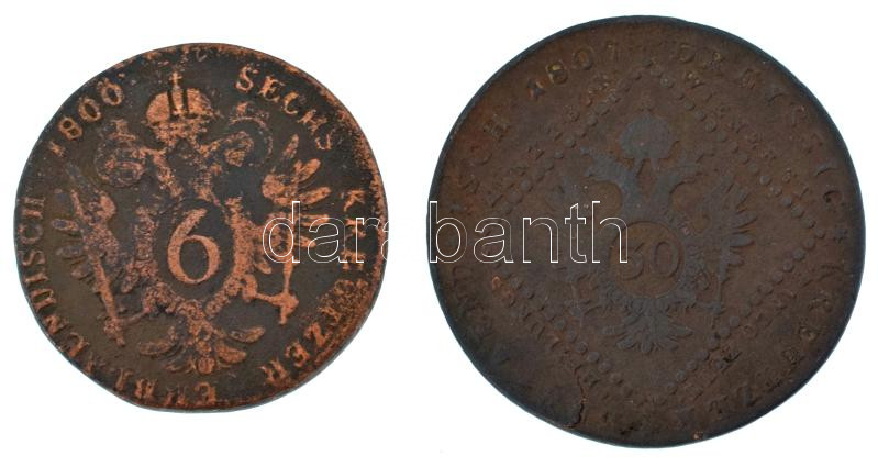 Leírás: 1807E 30kr Cu "I. Ferenc " Gyulafehérvár + 1800S 6kr Cu "I. Ferenc " Szomolnok T:F, patina