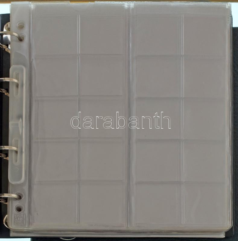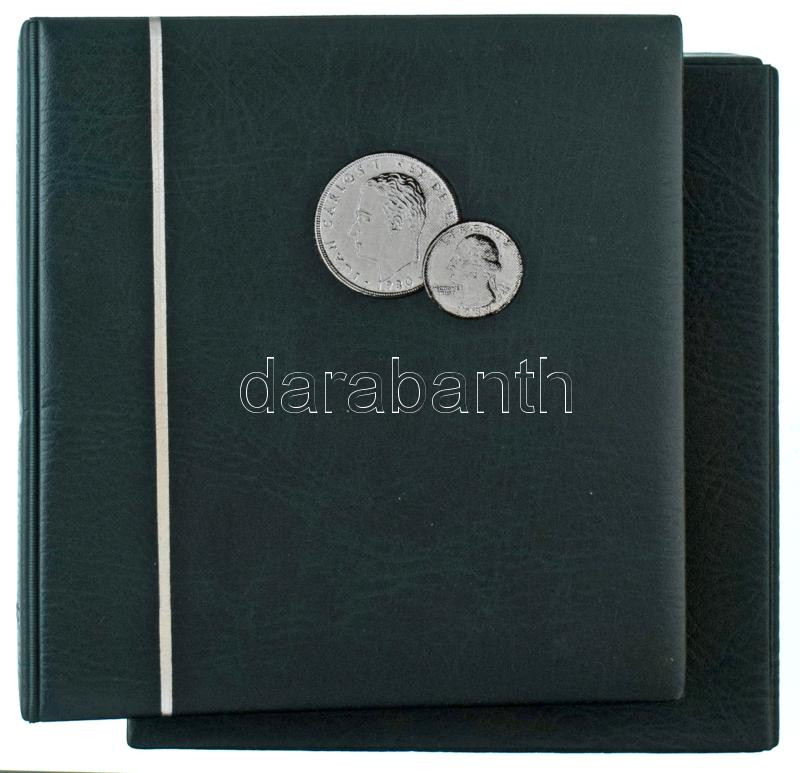 Leírás: "NUMIS " zöld műbőr négygyűrűs érmeberakó album tokkal + 10db berakólappal, egyenként ~34,5mm-es fészekkel (200x) + 4db osztatlap berakólap soros tartóval, egyenként ~34,5mm-es fészekkel (80x), összesen 280db férőhellyel. Újszerű állapotban