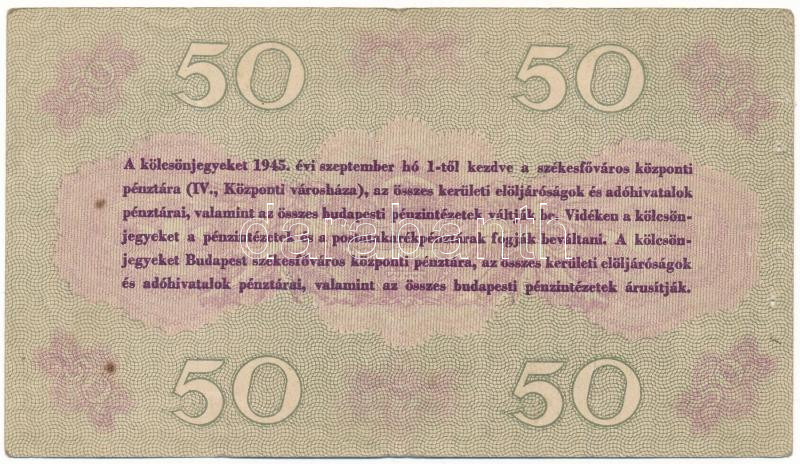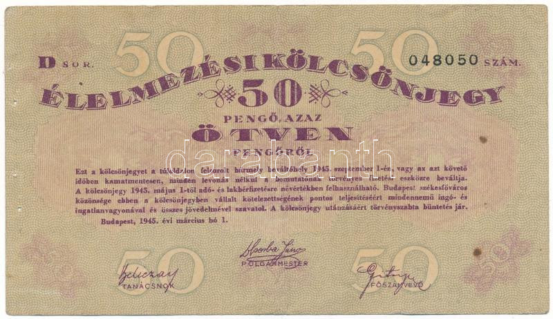 Leírás: 1945. Budapest 50P "Élelmezési Kölcsönjegy ", "D 048050" T:F, tűzőgéplyukak