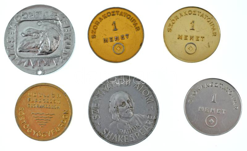 Leírás: 1973. "Kutyakiállítás Esztergom / 1000 éves Esztergomi emlékkiállítás - MEOE " (Magyar Ebtenyésztők Országos Egyesülete) kétoldalas Al emlékmedál (37,5mm) + DN "Szentivánéji Álom " kétoldalas Al zseton (37mm) + DN "Sóstógyógyfürdő / Üdüljön Fürdőzzön Szórakozzon Sóstógyógyfüdőn " kétoldalas aranyozott Al zseton (29mm) + DN "Szórakoztatóipar - 1 Mene t" egyoldalas Al játéktermi zseton (3xklf színben), (30mm) T:VF