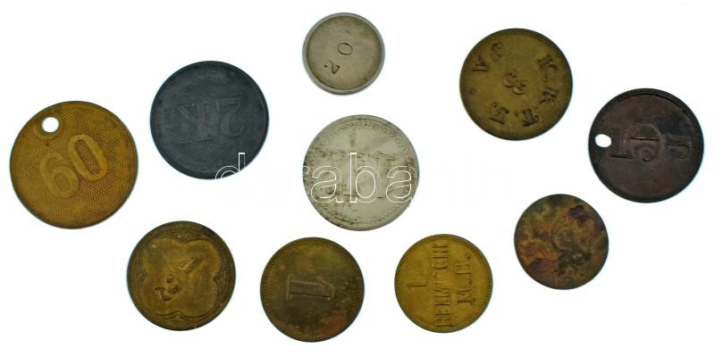 Leírás: DN 10xklf számozott / névértékes zseton / bárca tétel, közte DN "1 HELMISCHE M. B. / Massigkeit Schützt vor Torheit Nicht " kétoldalas Cu zseton T:XF,VF, patina