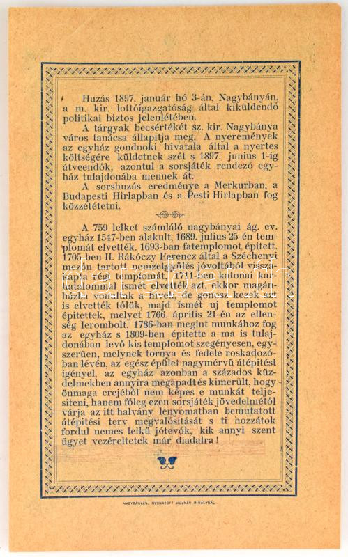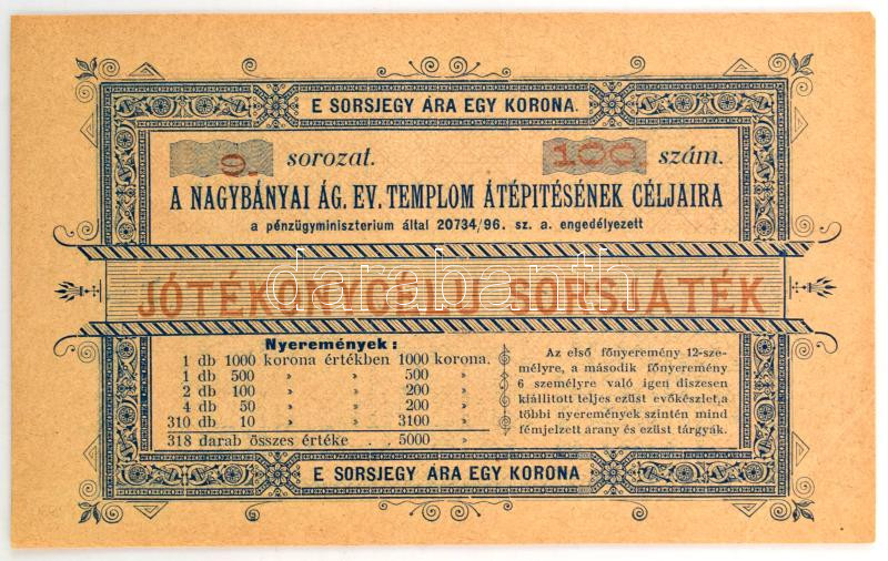 1896 Nagybánya 1896. "A nagybányai ág. ev. templom átépitésének céljaira Jótékonycélu sorsjáték " 1K értékű, sorszámozott sorsjegy T:XF sarokhajlás