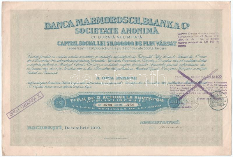 Leírás: Máramaros 1909. "Máramarosi Bank Részvénytársaság " részvénye 2500L-ről, bélyegzésekkel, 3xklf nyelvű leírással (román, francia, angol) T:XF,VF, folt