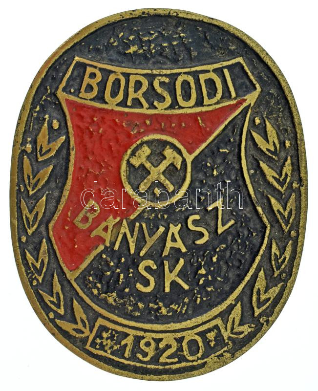 1970 k. "Borsodi Bányász SK" egyoldalas, részben festett, öntött bronz plakett. A Borsodi Bányászt 1920-ban alapították Sajószentpéteren, Sajószentpéteri Bányatelepi TK néven. A klub jobbára a III. és IV. osztálynak számító ligák között ingázott egészen a kommunizmusig, mikor a sajószentpéteri klub is fellendült: 1949 és 1954, majd 1957 és 1964 között is a másodosztály tagja volt. 1965-től jobbára a harmadik ligában szerepelt, egészen 1990-ig, mikor márciusban bejelentették a labdarúgó-szakosztály megszűnését. A játékosok ezután Sajóbábonyba kerültek, ahogy az NB III-as szereplés joga is. (93x76mm) T:XF