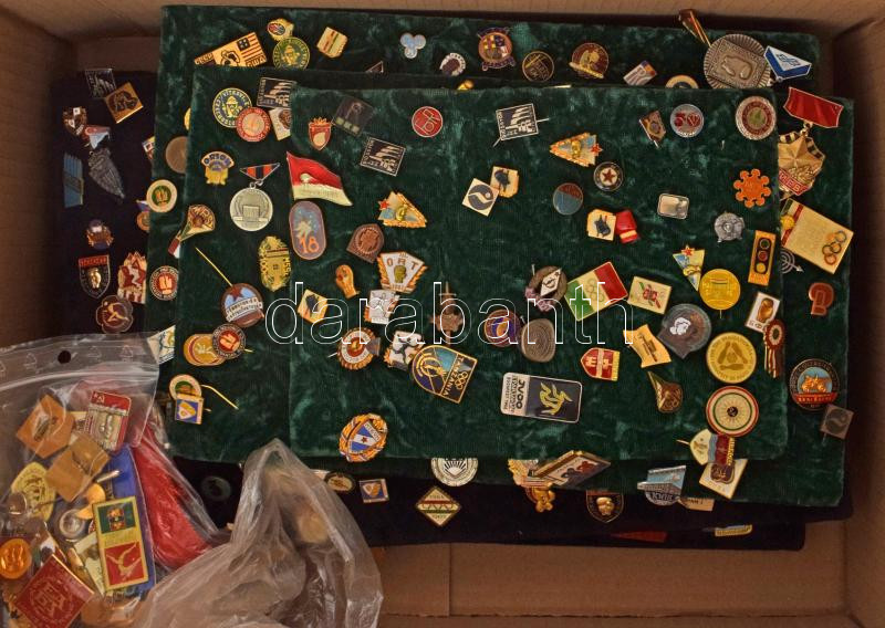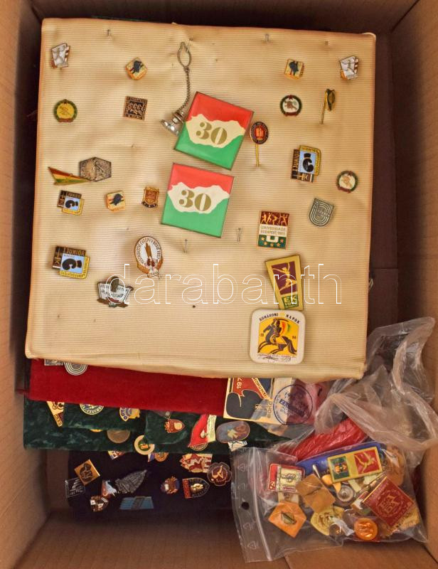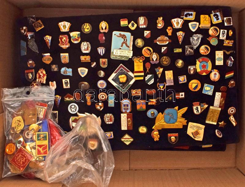 Több mint 500db-os, főleg sportjelvényekből (azon belül főleg olimpiai, ökölvívó és labdarúgás) álló tétel, közte rengeteg magyar és ismert külföldi futballklub (köztük Honvéd, Fradi, MTK, Újpest), ezen kívül nemzeti szövetségek, olimpiai jelvények, ökölvívó események. A jelvények nagy része összesen 5db jelvénytartó tálcára rendezve (+3db üres tálca). Ezen kívül 15db ökölvívó plakett és díjérem, a díjérmek nagyrésze szalagon. T:vegyes