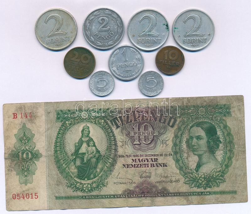 Leírás: 1936. 10P + 1941. 1P Al 1943. 2P Al + 1946. 20f tombak + 2Ft Al + 1947. 10f tombak + 2Ft Al (2x) + 1960. 5f Al (2x) T: érmék: XF-F, bankjegy: VG