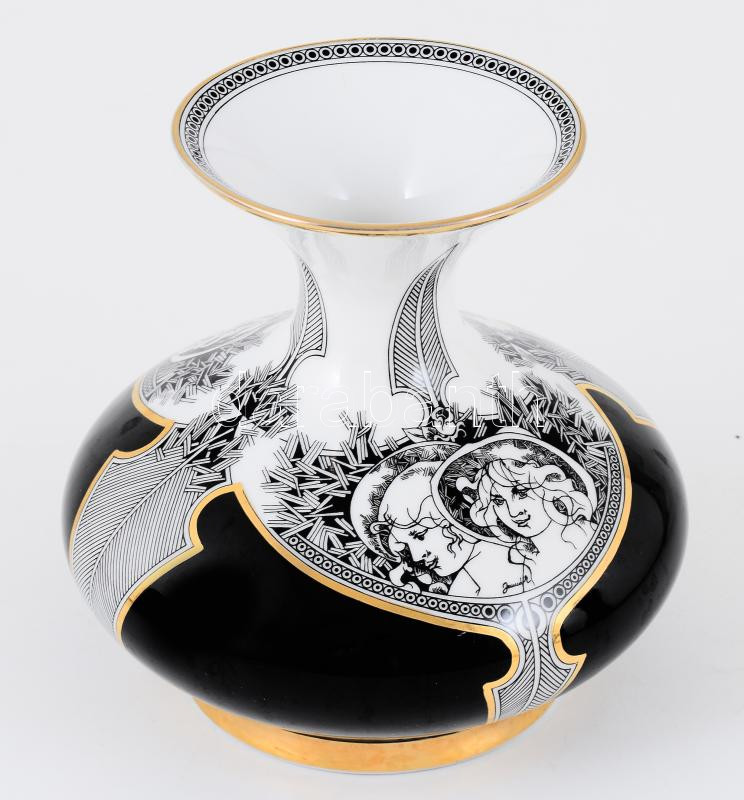 Leírás: Hollóházi Jurcsák László által tervezett váza: Női fejek. Matricás, jelzett, hibátlan, m: 15,5 cm