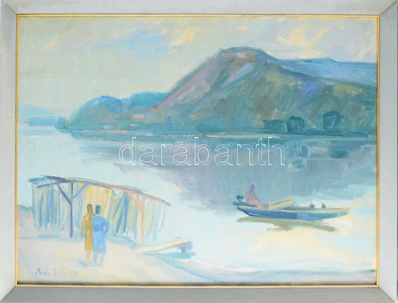 Leírás: Halász Szabó Sándor (1920-1997): Halászok a Dunakanyarban, 1961. Olaj, vászon, jelezve balra lent, fakeretben. 60x80 cm