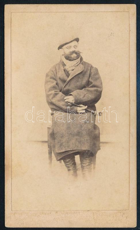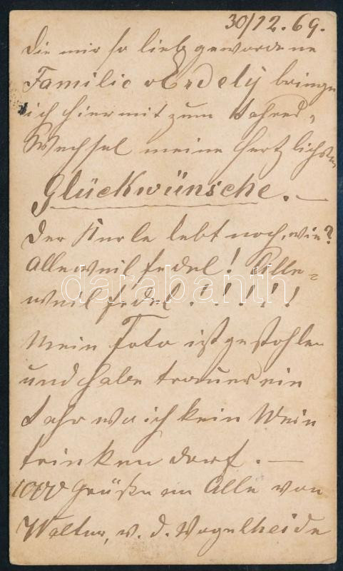 1869 Érdekes megjelenésű úr portréja, vizitkártya, a hátoldalon német nyelven sűrűn teleírva, megfejtendő szöveggel (,,Familie Erdély" (?), illetve ,,Glückwünsche" szavak kivehetők), 10,5x6 cm