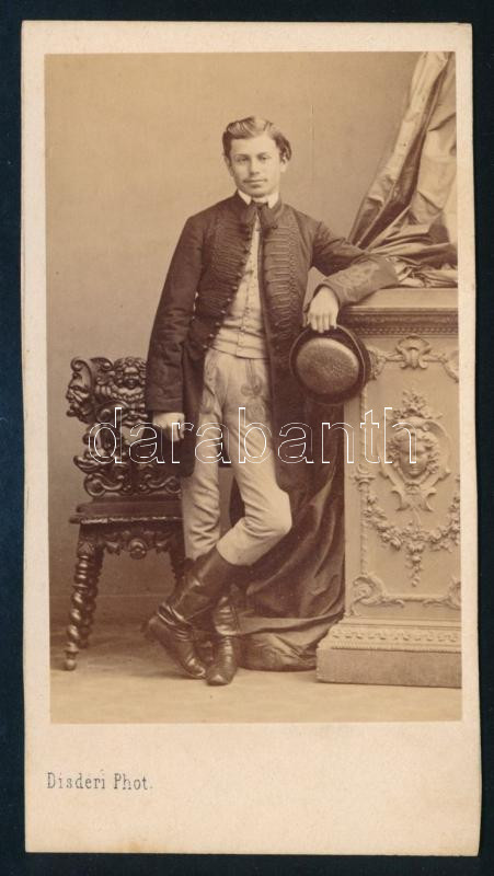 Leírás: cca 1860-1870 Párizs, elegáns fiatal úr díszmagyarban, vizitkártya André Disdéri francia fényképész műterméből, 10,5x6 cm