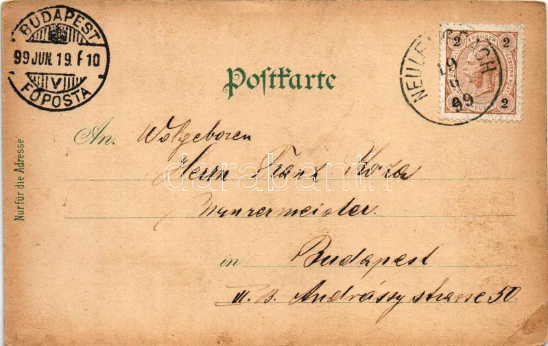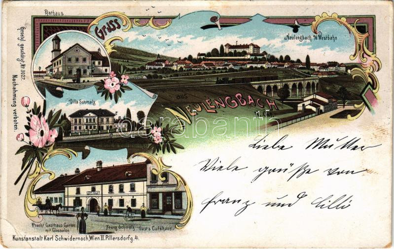 1899 (Vorläufer) Neulengbach, Rathaus, Westbahn, Villa Schmalz, Pracht Gasthaus Garte mit Glassalon, Franz Schmalz Gast und Café Haus. Kunstanstalt Karl Schwidernoch No. 3027. / town hall, railway station, inn, restaurant, café. Art Nouveau, floral, litho (EB)