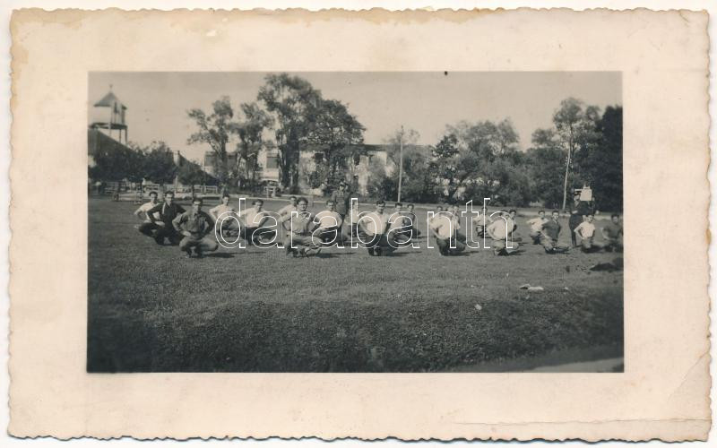 Leírás: 1937 Farkasvágó, Lunca Calnicului; munkatábor, sportolók / labor camp, sport. photo (gyűrődések / creases)