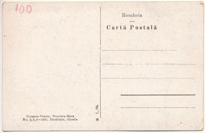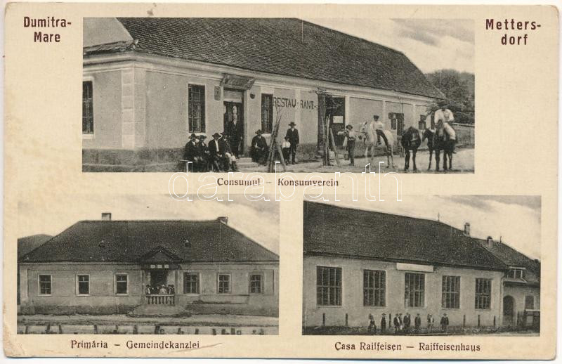 Nagydemeter, Dumitra Mare, Mettersdorf; Consumul, Primaria, Casa Raiffeisen / Konsumverein, Gemeindekanzlei / Raiffeisenhaus / Fogyasztási szövetkezet, étterem, Raiffeisen ház, községháza / cooperative shop, restaurant, villa, town hall (EB)