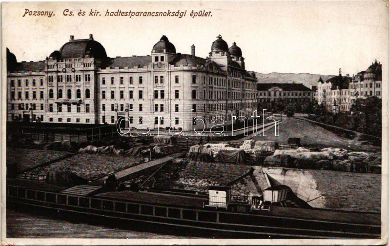 1916 Pozsony, Pressburg, Bratislava; Cs. és kir. Hadtestparancsnoksági épület, kikötő, rakpart. A képeslap címzettje Dr. Réthy Mór matematikus (1846-1925) / Army Headquarters, port, quay (EK)