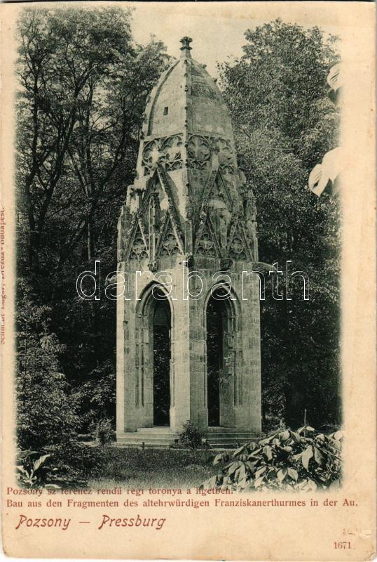 Leírás: Pozsony, Pressburg, Bratislava; Szt. Ferenc rendűek tornya a ligetben. Schmidt Edgar kiadása / monument in the park (vágott / cut)