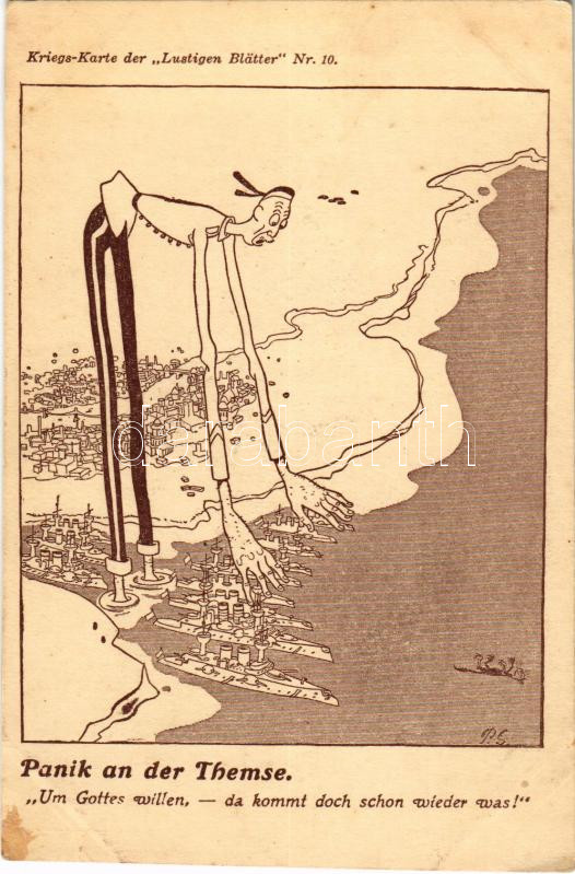 Panik an der Themse. Kriegs-Karte des Lustigen Blätter Nr. 10.. Druck von H. S. Hermann (Berlin) / German military art postcard, panic by the Thames (fl)