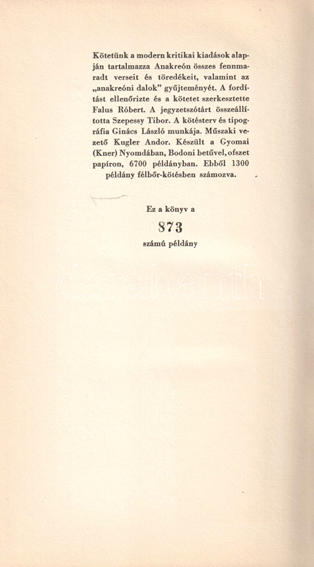 Bibliofil kiadásunk kolofonja: "Kötetünk a modern kritikai kiadások alapján tartalmazza Anakreón összes fennmaradt verseit és töredékeit, valamint az "anakreóni dalok" gyűjteményét. A fordítást ellenőrizte és a kötetet szerkesztette Falus Róbert. A jegyzetszótárt összeállította Szepesy Tibor. A kötésterv és tipográfia Ginács László munkája. Műszaki vezető Kugler Andor. Készült a Gyomai (Kner) Nyomdában, Bodoni betűvel, 6700 példányban. Ebből 1300 példány fél-bőr kötésben, számozva. Ez a könyv a 873. számú példány".