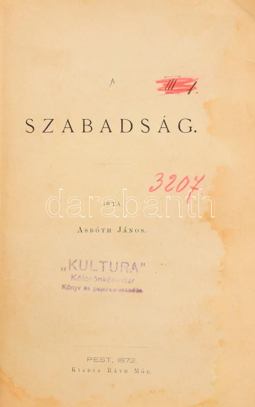Asbóth János: A szabadság. Pest, 1872., Ráth Mór, 8+446+2 p. Kiadói pa... https://www.darabanth.com/hu/502-Gyorsarveres/502.0/Konyvek/Konyvek-Egyeb-ritkasagok~2500020/Asboth-Janos-A-szabadsag-Pest-1872-Rath-Mor-8plus446plus2-p-Kiadoi-papirkotesben-Foltos-lapokkal~II3418082