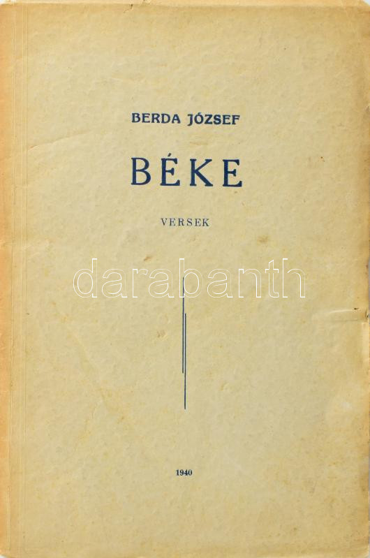 Berda József: Béke. Versek. [Újpest], 1940., [Özv. Ritter Jenőné], 31+1 p. Számozott (108./500) és a szerző, Berda József (1902-1966) Baumgarten- és József Attila-díjas költő által ALÁÍRT példány.